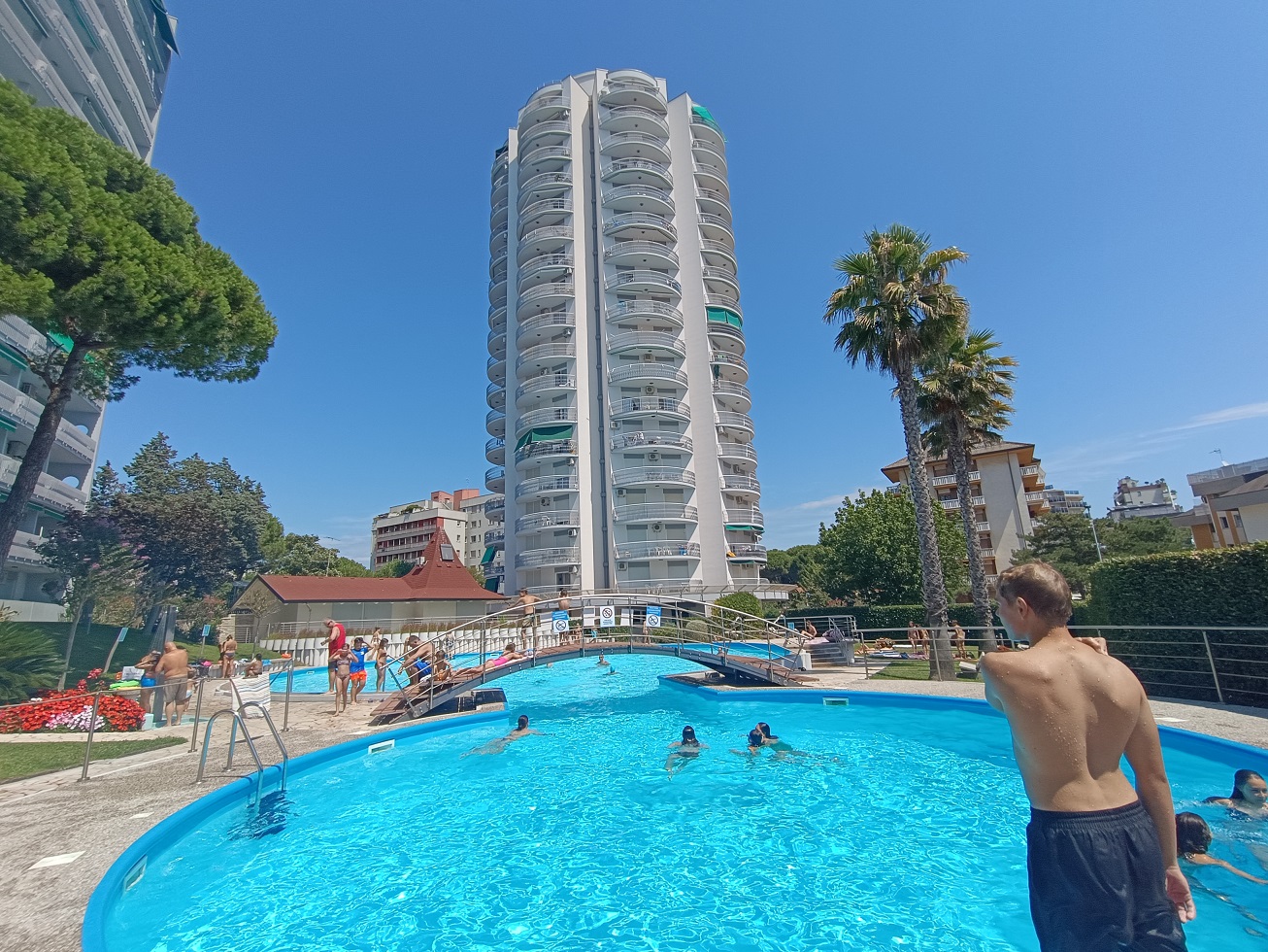 Rez. Duna s bazénom Rezidencia sa nachádza pár krokov od pláže (cca 80 m) v pokojnej časti Sabbiadora, neďaleko Juniorparku a hlavného námestia Piazza City. V bezprostrednej blízkosti rezidencie je malý supermarket, kaviareň Milano, reštaurácia Peperoncino, niekoľko fast foodov i predajňa ovocia a zeleniny. Neďaleko je aj obľúbený supermarket IN´S MERCATO. Vzadu za rezidenciou je veľké oplotené parkovisko, kde sú vyhradené miesta na parkovanie, vpredu pred rezidenciou je upravený trávnik a dva bazény - jeden pre deti, druhý pre dospelých. Rezidencia má veľkú modernú vstupnú halu a 4 výťahy.
