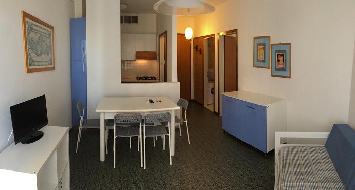 4-lôžkový apartmán s jednou spálňou(B1) sa skladá z obývacej izby, kde je kuchynský kút a dve lôžka, zo spálne s manželskou posteľou a z kúpelne s moderným sprchovým boxom/bidetom/WC. Má dvojnásobne veľkú terasu oproti ostatným apartmánom v tejto rezidencii - je na ňu výstup aj z obývacej izby aj zo spálne. Výhľad na more. Na terase je záhradný nábytok.